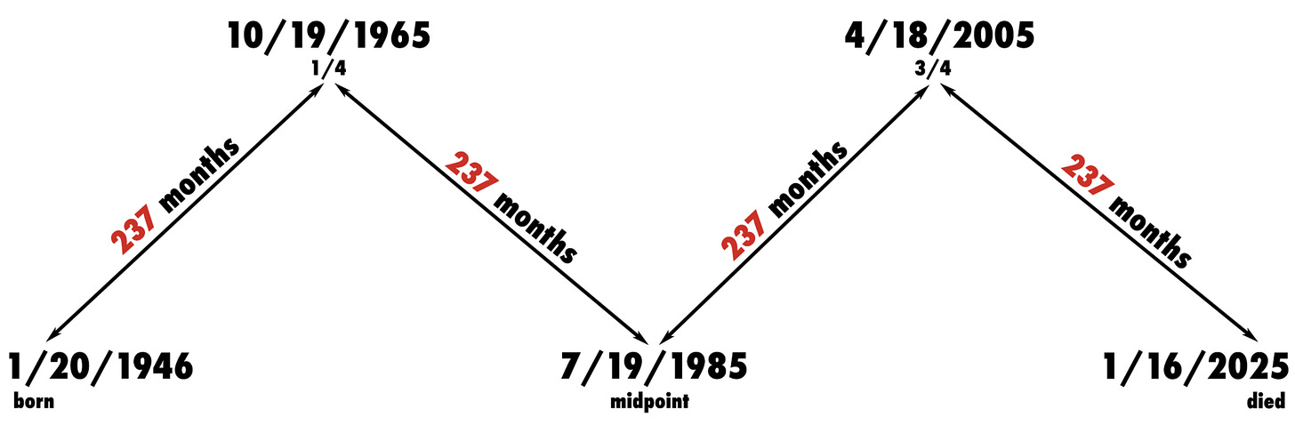 How did he do this you ask? By dying. When David Lynch died on 1/16/2025 I did the same thing I do when anyone expires: measure the lifespan, find the mid-point. I was amazed to discover that, having passed away only 4 days before his 79th birthday, Lynch had lived for 4 blocks of 237 months (99.9% exact). Naturally I went ahead and divided his life into quarters to examine each node for synchronistic residue, and guess what dividing a life into quarters creates?