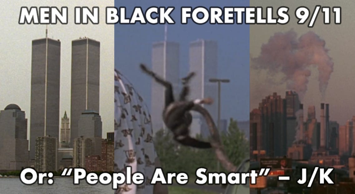 It’s only now almost 30 years later that we are beginning to find the context needed to see that Men in Black was actually more like entrainment — 100% unequivocally a pre-game ritual for the events of 9/11/2001.